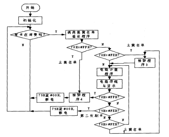 1、如電能表處于待機(jī)狀態(tài),則接收刷卡,讀出卡內(nèi)信息,同時(shí),置RAM79H的值為#FFH,然后返回主程序。主程序調(diào)用黑黃名單驗(yàn)證子程序,如用戶卡已上電量不足的黑名單則報(bào)警同時(shí)返回主程序;當(dāng)用戶卡上電量小于10度的黃名單時(shí)報(bào)警但繼續(xù)為該用戶供電,直到電費(fèi)全部用完后停止供電;當(dāng)用戶卡不上黑黃名單時(shí),則正常為該用戶供電,同時(shí)調(diào)用電能計(jì)量程序。