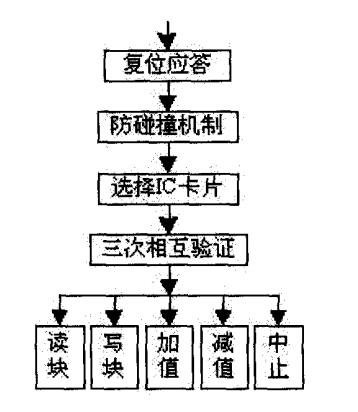 MFRC500能執(zhí)行有限的一些指令,并將這些指令傳輸?shù)?/span>MIFARE1用戶卡片上,單片機(jī)對MFRC500的某一指令操作不是簡單的一條指令所能完成的,須有一個(gè)程序序列來完成,其中有對MFRC500硬件內(nèi)核寄存器的設(shè)置以及判斷。在進(jìn)行讀寫數(shù)據(jù)或增、減值操作之前還須經(jīng)過復(fù)位應(yīng)答、防碰撞、選卡及認(rèn)證過程。操作流程圖如圖6所示。本設(shè)計(jì)釆用基于Keil CC語言進(jìn)行編程,調(diào)用Philips公司提供的基本庫函數(shù)來實(shí)現(xiàn)各種功能。
