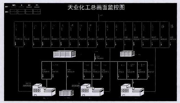 在下位機硬件和上位機軟件系統平臺搭建完成后,可以利用工業組態軟件平臺設計監 測與監控系統,該系統提供能源消耗及使用數據的實時顯示與分析、歷史記錄與趨勢查詢、各種報表與統計等,如系統功能實時顯示現場生產數據與趨勢,各畫面之間可方便地切換 (如圖4為新疆天業化工有限責任公司總畫面監控圖),可根據生產需要對現場數據進行采集 統計與運算處理,并通過各種形式實時顯示。