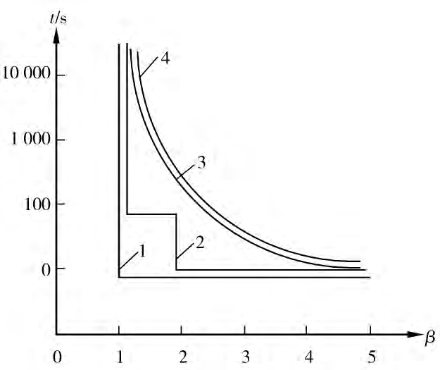 在這里,通常將電動機(jī)過載保護(hù)特性定義為:電動機(jī)的過載倍數(shù)與其過載保護(hù)動作時間之間的關(guān)系。如圖3所示為電動機(jī)的過載保護(hù)特性曲線。