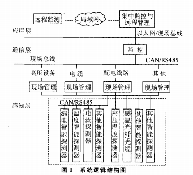 智能化監控系統基于嵌入式軟硬件平臺,嚴格遵從“設備智能化、系統網絡化、狀態信息化、安全可視化”的產品定位,構建一體化分布式電氣火災智能化綜合監控系統。系統架構基于物聯網系統模型及B/s軟件體系,按照“感知層、通信層、應用層”標準實施系統建模。系統組成具體包括:處于感知層的電氣火災監控探測器、無線溫度探測器、分布式感溫光纜等;處于網絡層的通信網絡、現場總線及實現區域監測管理功能的監控器等;處于應用層的監控設備、遠程監控中心及客戶終端等。系統邏輯結構,如圖1所示。