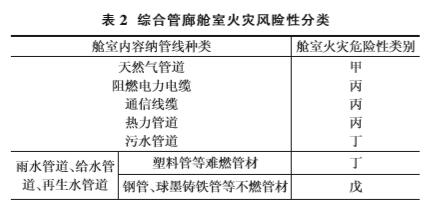 根據(jù) 《城市綜合管廊工程技術(shù)規(guī)范》(GB508382015),綜合管廊艙室火災(zāi)危險(xiǎn)性分類如表2所示:天然氣管道艙室的火災(zāi)危險(xiǎn)性類別為較高級(jí);阻燃電力電纜、通信電纜、 熱力管道的火災(zāi)危險(xiǎn)性類別均為丙級(jí);污水管道、塑料管等難燃管材的火災(zāi)危險(xiǎn)性類別均為丁級(jí);鋼管、球墨鑄鐵管等不燃管材的火災(zāi)危險(xiǎn)性類別為戊級(jí)。