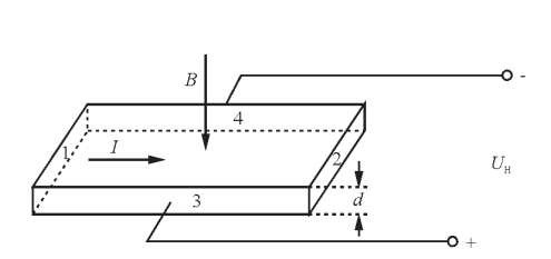 式中:RH是霍爾系數(shù)(是由材料性質(zhì)決定的一個(gè)常數(shù)),對于金屬導(dǎo)體而言,RH=1/nq(n為載流子濃度或自由電子濃度,q為電子電量。),I為通過器件的電流,B為垂直于I的磁感應(yīng)強(qiáng)度,d為導(dǎo)體的厚度,KH=RH/d稱為霍爾元件的靈敏度,它是表征單位磁感應(yīng)強(qiáng)度和單位電流時(shí)的霍爾電壓輸出大小的一個(gè)重要參數(shù),一般希望它越大越好。若保證式(1)中I不變,那么,在一定條件下,就可通過測量霍爾電壓UH來推算出磁感應(yīng)強(qiáng)度B的大小,并由此建立了磁場與電壓信號的聯(lián)系。根據(jù)這一關(guān)系,人們研制出了霍爾器件。