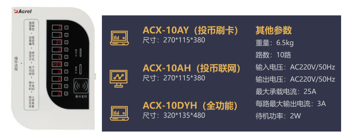 其中ACX-10AY投幣刷卡型可通過投幣和刷卡充電,刷卡充電需要在管理處預(yù)存電費充值;