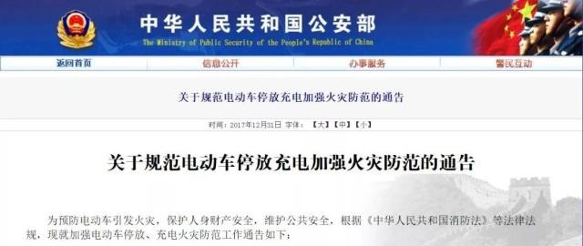 電動自行車的安全隱患引起了各級政府部門的重視,20171229日公安部消防局發(fā)布《關(guān)于規(guī)范電動車停放充電加強火災(zāi)防范的通告》,要求充分認識電動車火災(zāi)危害,落實停放充電管理責(zé)任,規(guī)范電動車停放充電行為,嚴(yán)厲查處違規(guī)停放充電行為。