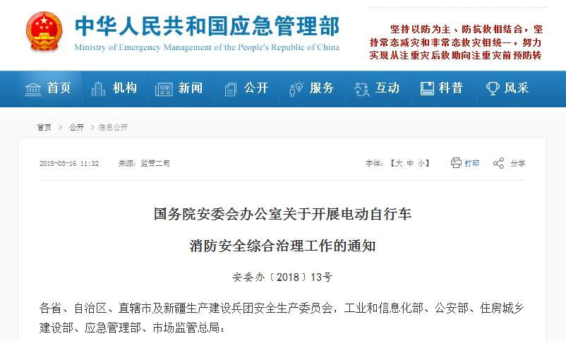 2018515日國務(wù)院發(fā)布《國務(wù)院安委會辦公室關(guān)于開展電動自行車消防安全綜合治理工作的通知》開展電動自行車消防安全綜合治理工作。