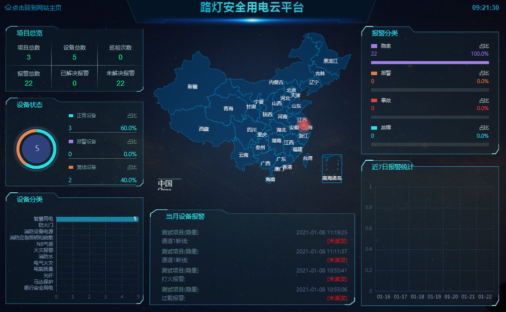 APP推送,短信,語音電話和郵件等,時間到達責任人的身邊,提醒運行人員接觸器跳閘,電源失壓等等。平臺也可以設置開合閘時間,每天定時控制路燈控制器的啟動和關閉。