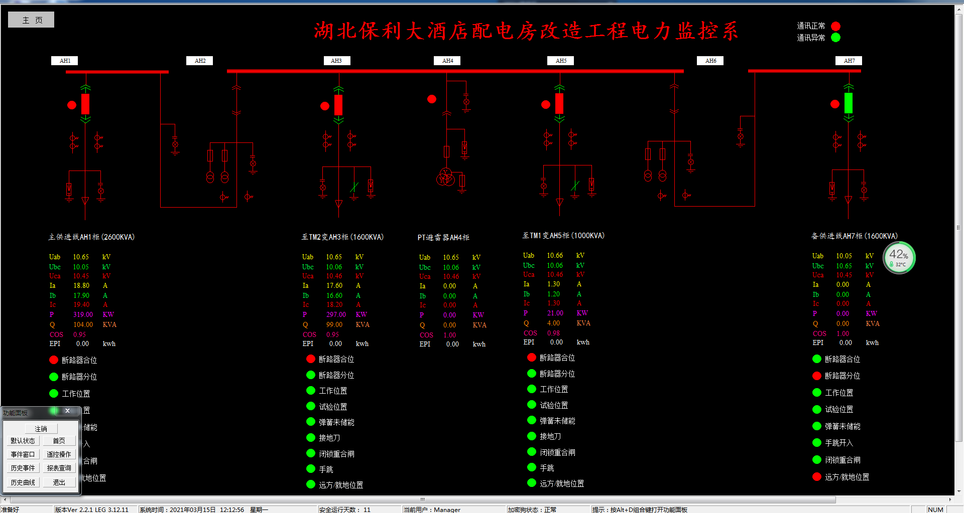 遙信和遙測報警功能,主要完成對低壓各出線回路的開關運行狀態和負載進線監控,對開關變位和負載越限彈出報警界面指示具體的報警位置并聲音報警