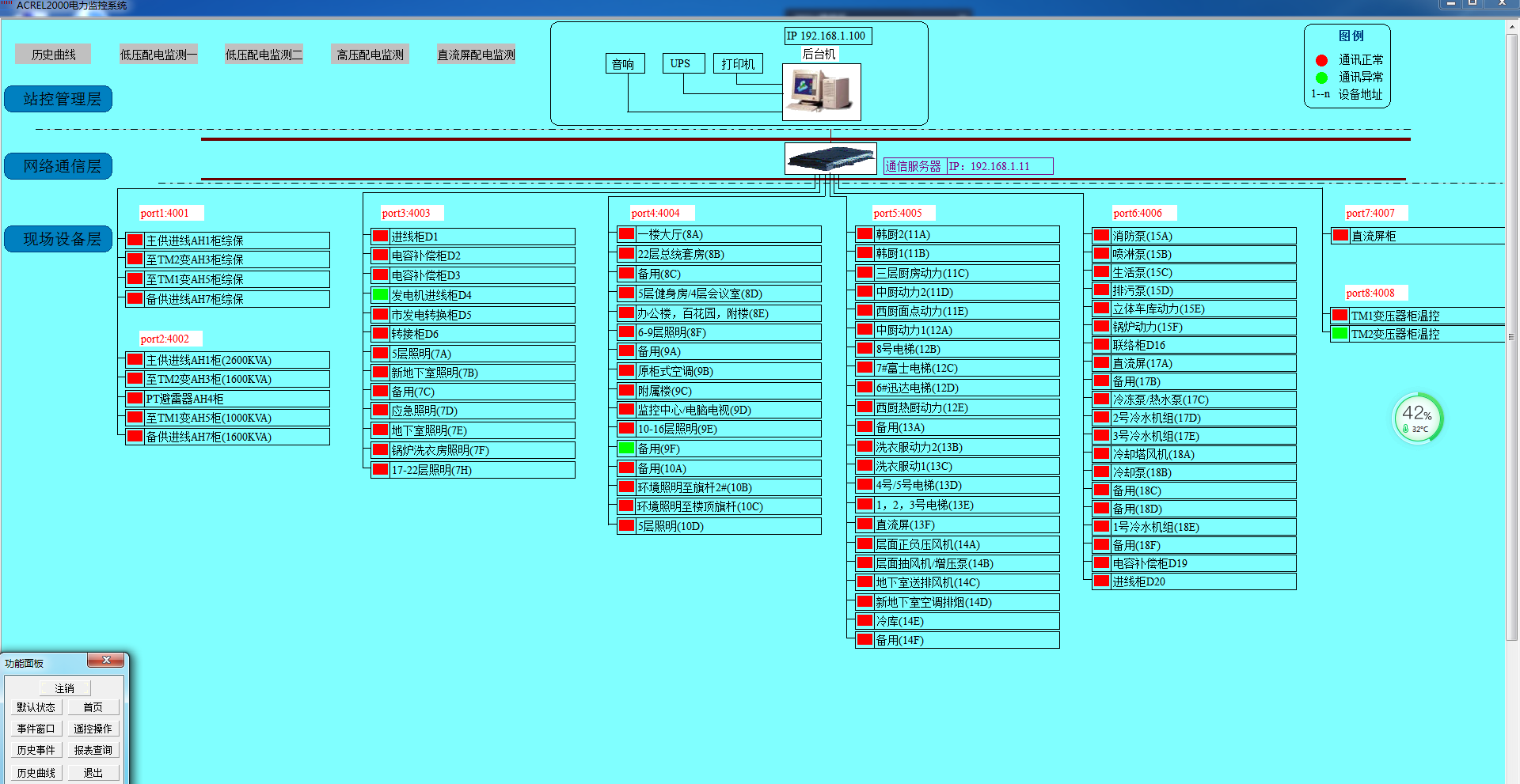 顯示系統的組網結構,系統采用分層分布式結構,同時監測間隔層設備的通信狀態。紅色表示通訊正常,綠色表示通訊故障。