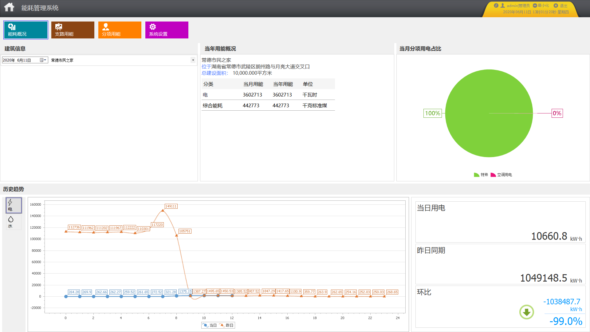主頁面顯示該建筑的建筑圖片,建筑基本信息,建筑當月分項用電餅圖和各種能源的消耗量。根據所選的建筑,對其建筑圖片進行加載,可以選擇時間查看建筑能耗情況,選擇建筑或時間后自動刷新,默認為當天。