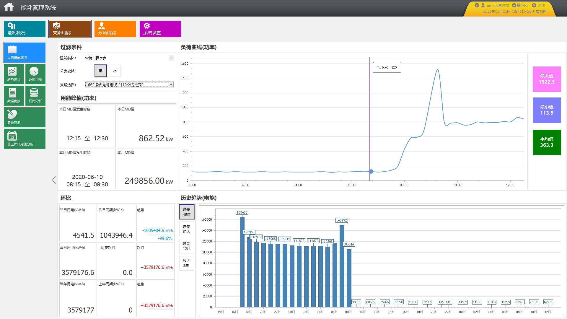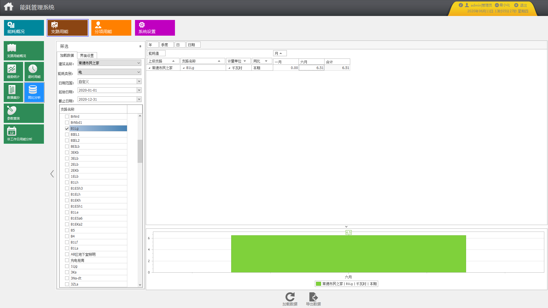 系統可將各主要耗能設備的能耗與去年同期值和上月值進行同比環比分析,檢驗節能效果,根據分析結果執行節能績效考核,以及節能目標的修正。統計各支路當年每月用能及去年同期用能;