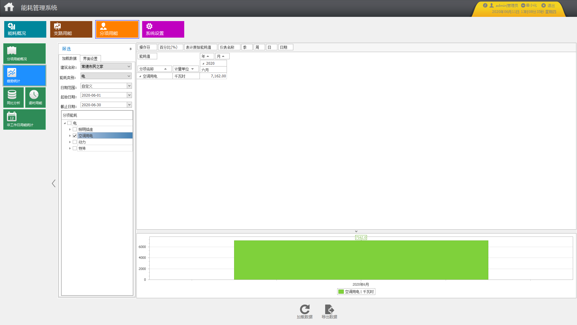 系統可以統計各分項某段時間內逐日、逐周、逐月、逐季、逐年用能。可查看分項中各支路用能趨勢,可根據已有的日期或者自定義時間進行查詢,統計數據可導出至Excel