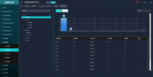 能耗分析功能包括了能耗概況、能耗同比、能耗環比、能耗報表和能耗預測等五個模塊。可以查看登錄用戶下的所有項目的能耗統計、同環比和報表,且按日、周、月等維度進行能耗預測分析。