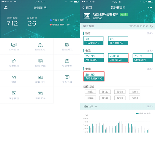 APP支持Android、iOS操作系統,方便用戶查看電氣火災、防排煙、消防水、消防設備電源、防火門、消防設備管理、視頻監控、火災報警等子系統的實時監控數據、報警信息、能耗統計等。