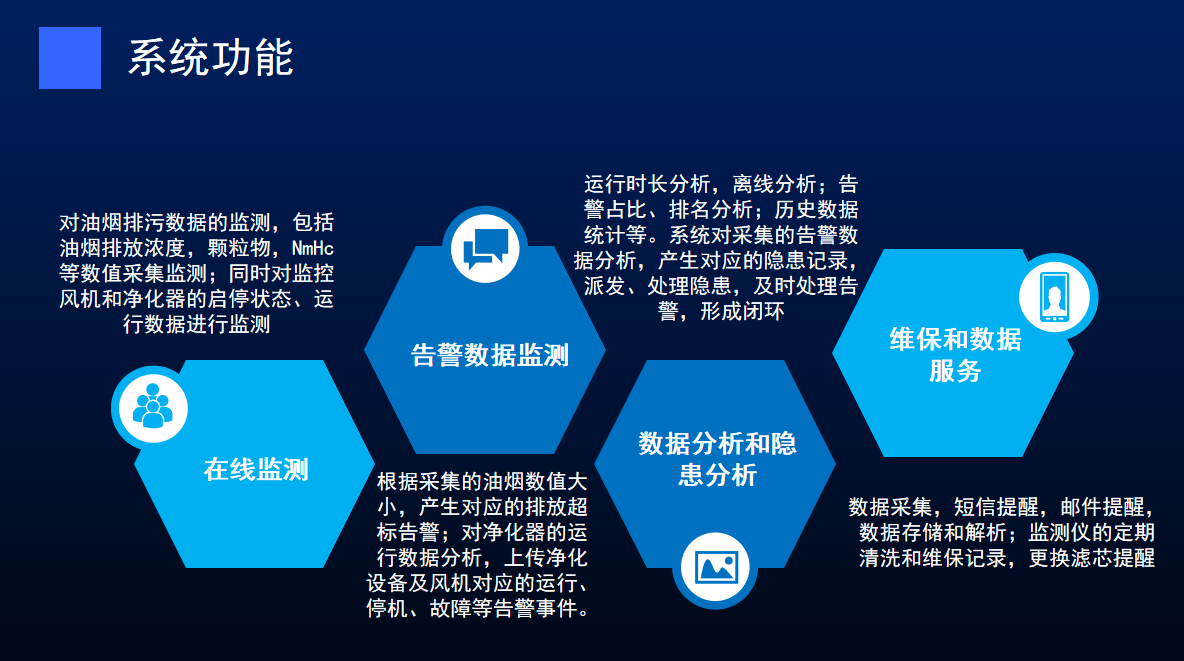 監測因子 監測因子 可實時監測油煙濃度、顆粒物濃度、非甲烷總烴濃度、傳感器連接狀態、風機及凈化器的電流及工作狀態