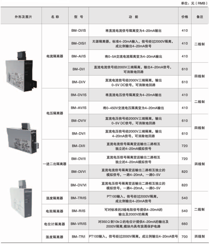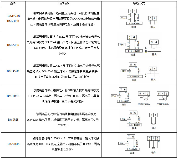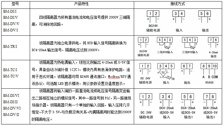 BM系列模擬信號隔離器可以對電流、電壓等電量參數或溫度、電阻等非電量參數進行高速精確測量,經隔離轉換成標準的模擬信號輸出。既可直接與指針表、數顯表相接,也可以與自控儀表(如PLC)、各種A/D轉換器以及計算機系統配接。